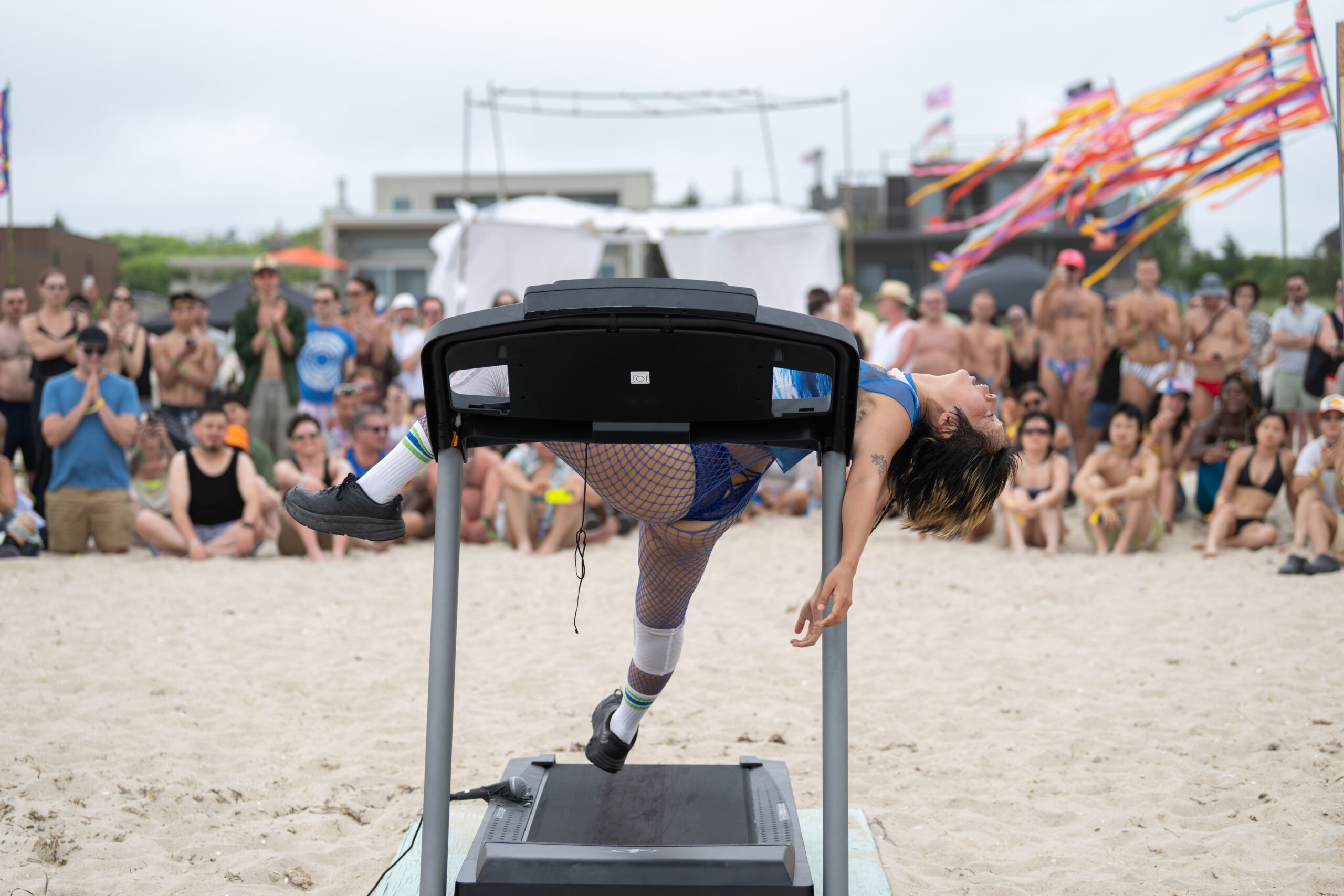 Evoking José Esteban Muñoz’s opening line of Cruising Utopia, Jas Lin invites Fire Island to orient toward the horizon beyond the island’s surfaces, enclosures, flags, and boardwalks. Lin utilizes the treadmill to chase the ecstasy of a runner’s high– stepping out of straight, linear time to draw new desire lines that lead us beyond the confines of the beaten path. In an increasingly surveilled world that even surveils the way we walk, this performance serves as a practice ground for rehearsing possibility while evading legibility. If ekstasis– the Greek root of ecstasy– means to stand outside of oneself, it also gestures toward stepping into the infinite potential of becoming. Dancing on the shoreline, how can we embody the horizon, one step after the other?